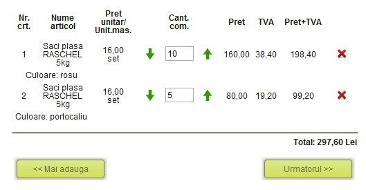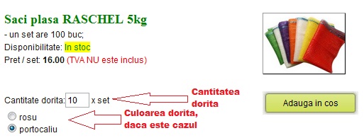 Pentru a adauga articole in cos, se acceseaza pagina produsului din meniul cu categorii din partea stanga. Pe pagina produsului unde este afisat: unitatea de masura, pretul unitar, caseta pentru introducerea cantitatii, si, in unele cazuri, daca este posibil culoarea articolului, se introduce in caseta de text, cantitatea dorita, si, eventual se selecteaza culoarea dorita.