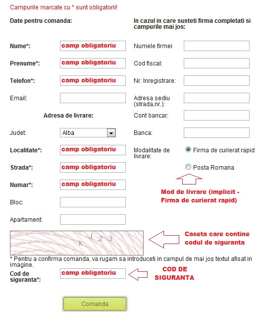 Formularul de comanda contine campurile obligatorii: Nume, Prenume, Telefon, Localitate, Strada, Numar, date obligatorii pentru livrarea produselor. Pe langa aceste campuri obligatorii mai exista un camp pentru securitate Cod de siguranta, deasupra butonului comanda. In acest camp se introduce codul aflat in caseta colorata de deasupra campului.